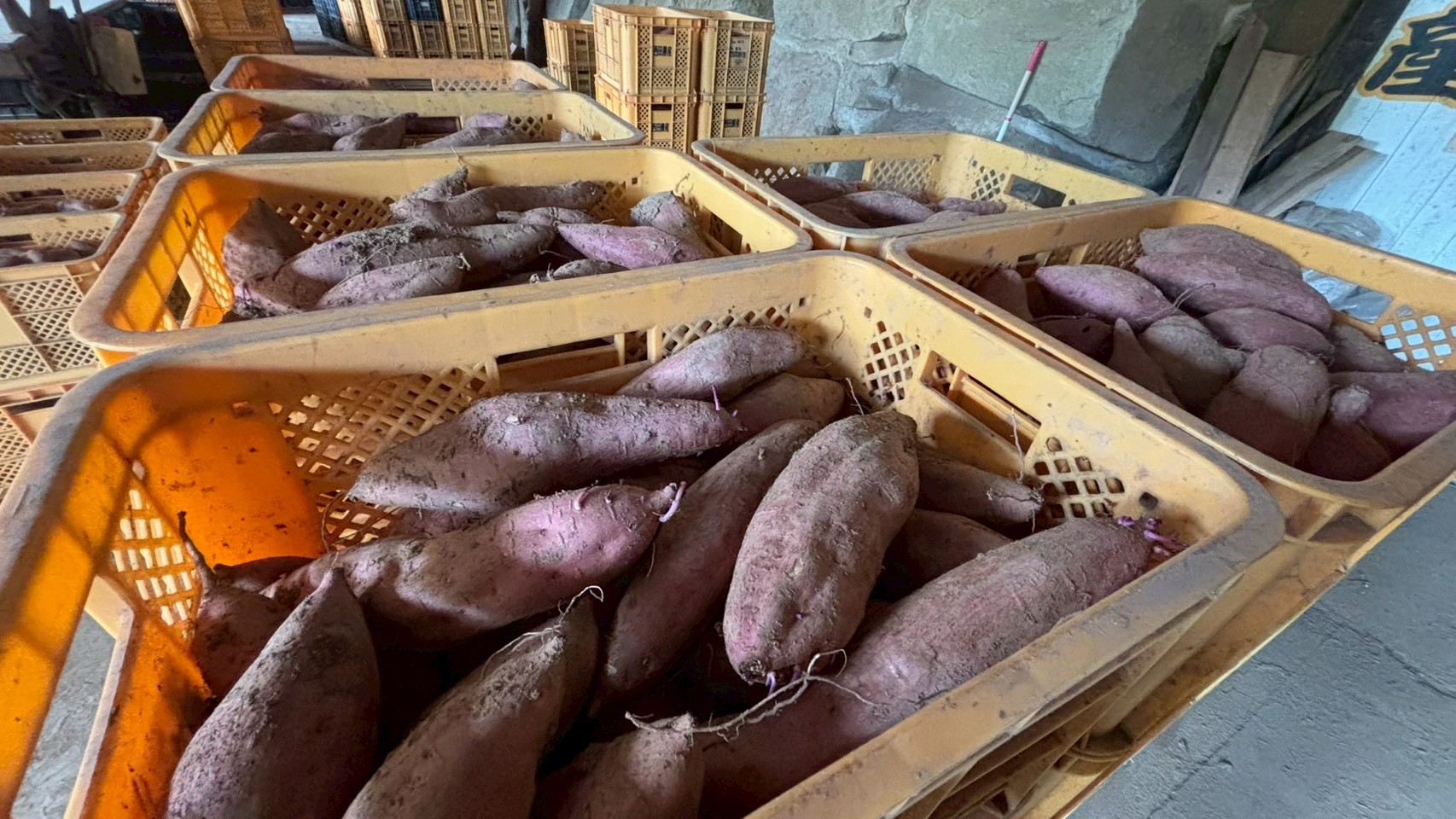 キュアリング処理(※)が終わり、これから3ヵ月間石蔵で寝かされる安納芋たち。